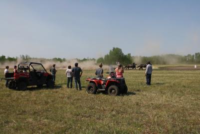 Das ist, was ich und Marius die restlichen 3 Wochen gemacht haben hier in Kanada. Ich schon etwas gewoehnt an riesen Babies, war Marius doch etwas respektvoller und zurueckhaltener. Wer bereits mit ihm gesprochen hat wird verstehen warum. Angst ist das einzige, was du im ersten Moment in Kontakt mit den Pferden verspuerst. Aber auch Marius hat nach einiger Zeit mehr Vertrauen aufbauen und ueber die ein oder andere Eigenart lachen koennen. Pferde sind anders als erwartet wahnsinnig neugierig, verspielt und viel mehr wie ein uebergrosser Hund, der sich im Dreck waelzt und mit Stoeckchen und Wasser spielt. Am letzten Mai Wochenende konnte Marius, und natuerlich auch ich, sein erstes Rennen und endlich auch den Grund fuer die ganze taegliche Arbeit auf der Farm sehen. Am selben Wochenende musste ich ihn dann aber leider auch gleich zum Bus bringen.