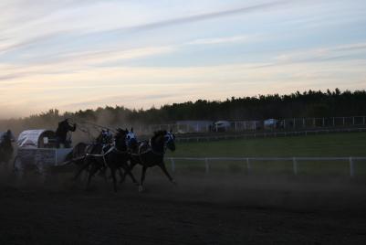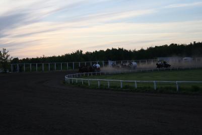 Hm, lass mich ueberlegen, zurueck in Deutschland bin ich fuer ein paar Mal mit Katrin zu ihren Pflegepferdchen gefahren, nur um wieder festzustellen, dass ich wirklich kein Pferdemensch bin. Diese grossen Kreaturen haben in mir immer Bewunderung hervorgerufen, aber mit einem Pferd alleine da zustehen hat mir doch immer geholfen mir in die Hosen zu machen. Was sollte mich also dazu bewegen hier in Kanada mit hyperaktiven, riesengrossen und sprunghaften Rennpferden zu arbeiten? Keine Ahnung, einfach nur weils der absolute Wahnsinn ist! Wer schonmal einen schoenen Westernschinken gesehen hat, weiss mit Sicherheit was ein Verpflegungswagen ist, in englisch `Chuckwagon`. Cowboys sind damit im wilden Westen durchs Land gezogen, vorne im Wagen sitzend der Koch und eine weisse Plane ueber dem Wagen, in dem sich die Kueche befand. Alle anderen Mitreisenden sind auf Pferden nebenher geritten. Das Problem im wilden Westen war aber, dass das Land durch das die Cowboys geritten sind, den Indianern gehoerte. Sobald also besagte Ureinwohner aufgetaucht sind um Stunk zu machen, musste alles wahnsinnig schnell zusammen gepackt und losgeritten werden, um nicht zu sagen, sie mussten rennen. Der kanadische Profi Chuckwagon Verband hat aus dieser Tradition einen Millionensport gemacht. Heute finden sich 3 bis 4 Wagen mit jeweils 4 Pferden auf der Rennstrecke wieder und rennen, um nicht zu sagen fliegen um die schnellsten Zeiten. Was hat das also alles mit mir hier zu tun? Shane Nolin, einer der erfolgreichsten Chuckwagonfahrer in Kanada hat mich fuer diesen Sommer als Stallhilfe eingestellt und hat mir damit die Moeglichkeit zu einer unglaublichen Erfahrung gegeben. Seit Anfang April lebe und arbeite ich also mit Shane und Stacey Nolin in Rapid View, Saskatchewan. Im April und Mai ging es einzig um das Training der rund 30 Rassepferde. Die deutsche Uebersetzung ist Rasse- oder Vollblutpferd, was im Endeffekt so viel heisst wie diese Pferde wurden einzig zum Rennen gezuechtet. Still stehen und relaxen ist niemals Programmpunkt im Leben dieser Pferde. In den vielen Wochen des Trainings konnte ich also langsam aber sicher lernen wie man einen Stall von Pferdepisse, Pferdescheisse und sonstigem, produziert von 20 Pferden, befreit haha. Nur Spass, das konnte ich vorher schon. Ich habe mit jedem Tag gelernt die Beweggruende und Art und Weisen eines Pferdes zu verstehen und ihre Energie und Stabilitaet aufzusaugen. Und natuerlich habe ich gelernt meine Fuesse immer so schnell wie die des Pferdes zu bewegen, es tut furchtbar weh, wenn man das nach 3 Wochen immernoch nicht hinbekommt. Was neben saubermachen noch zu meinen Aufgaben gehoert? Oh man, ich mache alles. Alles von Pferde buersten, Hufe sauber machen, Maehne schneiden, Pferdegeschirr anlegen, Pferde an den Wagen spannen, alle mit Futter versorgen.... ich habe so einiges gelernt von dem ich nie gedacht haette, dass ich das koennte. Die innere Gelassenheit und Ruhe, die ich bei der Arbeit mit den energiegeladenen Riesen bekomme ist unbezahlbar. Wenn dich ein springendes, tretendes und ausflippendes Pferd nicht aus der Ruhe und dein Herz nicht zum Rasen bringt, dann kann kommen was will. Mittlerweile kann ich mir gar nicht vorstellen im August dann weiter zuziehen, jedes einzelne Pferd waechst mir jeden Tag mehr ans Herz. Mit jeder Eigenart, die ich an ihnen entdecke, bin ich den grossen, neugierigen Toelpeln mehr verfallen. Sie auf der Rennstrecke rennen zu sehen, als ob es kein Morgen gibt, ist noch aufregender und laesst mich jedes Mal laecheln. Seit Ende Mai sind wir also jedes Wochenende unterwegs zu einer anderen Stadt, zu einem anderen Rennen.